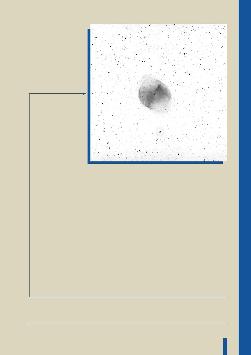を持った星が、進化の最終段階に放出したガスの雲である。星雲の中心には、もとの星の芯が残って見えている。写真は陰画で、向かって上が北、
