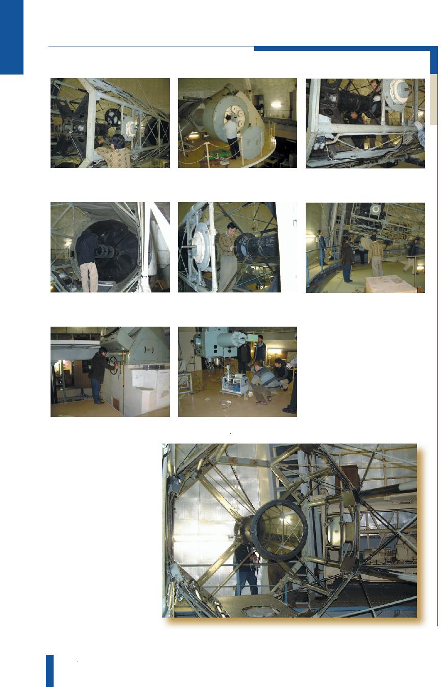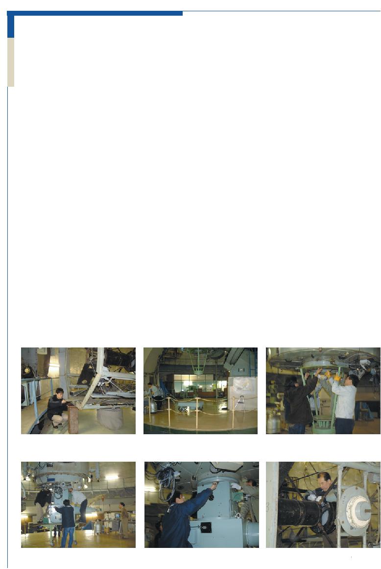 副鏡は焦点ごとに違うため今回は交換が必要となる。まず鏡筒を倒し、作業者はその中に入る(6)。
