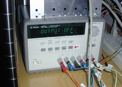 2. M-Front2用の電源の電源をいれる(インジケータが"OUTPUT OFF" となっている場合にはM-Front2に電源が供給されていませんので2X5個並んでいるボタンの一番右端の下(矢印マークの横)のボタンを押して電源を入れて下さい。電源を入れたらディスプレイに数値(電流、電圧など)が表示されるのを確かめてください。(図3-4)